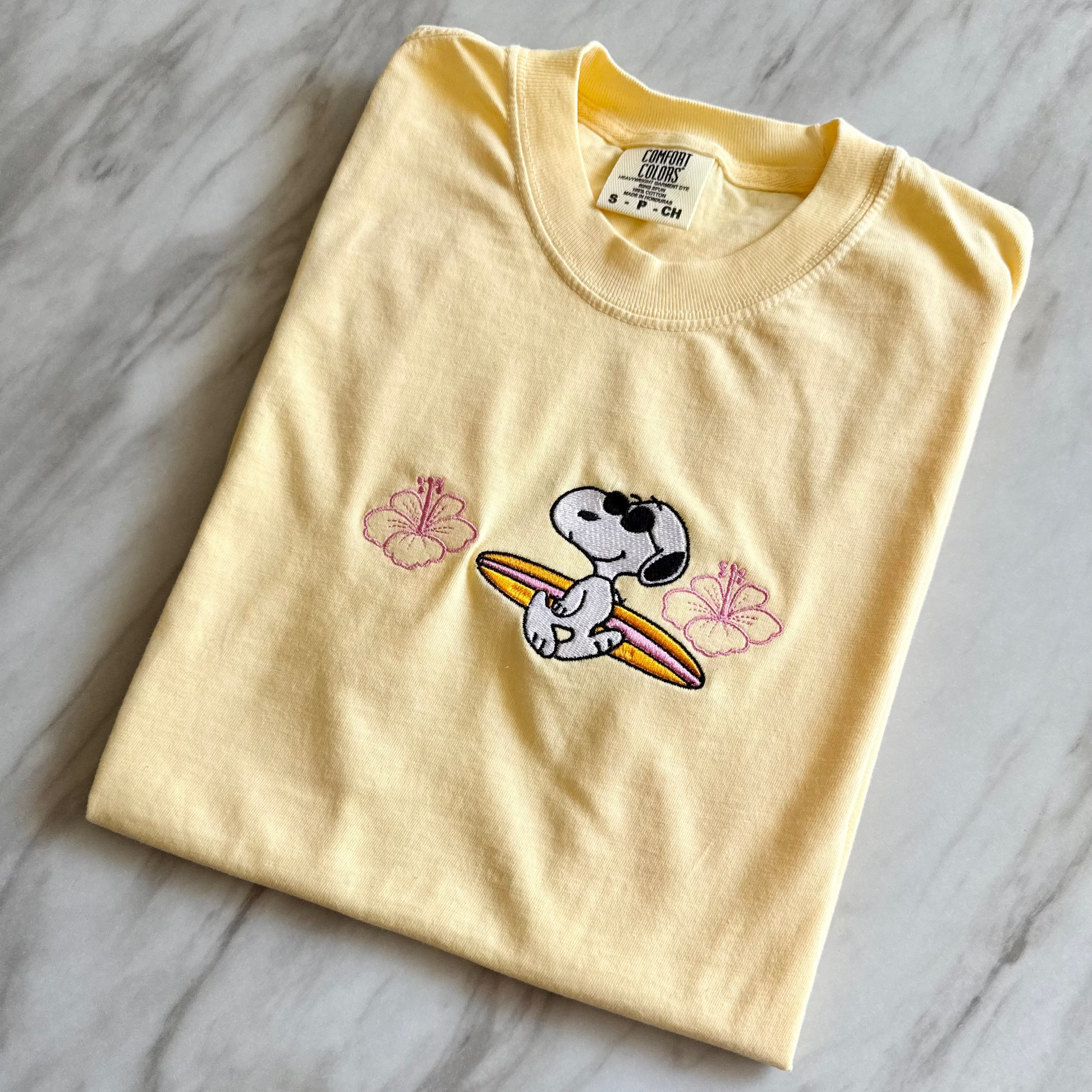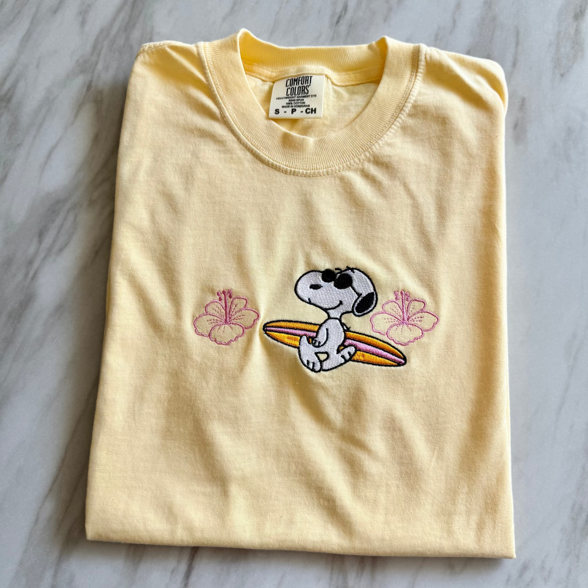 Say aloha to good vibes! 🌺🏄 Our Beach Day tee features Snoopy holding a surfboard, rocking his coolest shades, with hibiscus flowers framing both sides. The perfect shirt for sun-seekers and Peanuts fans alike.