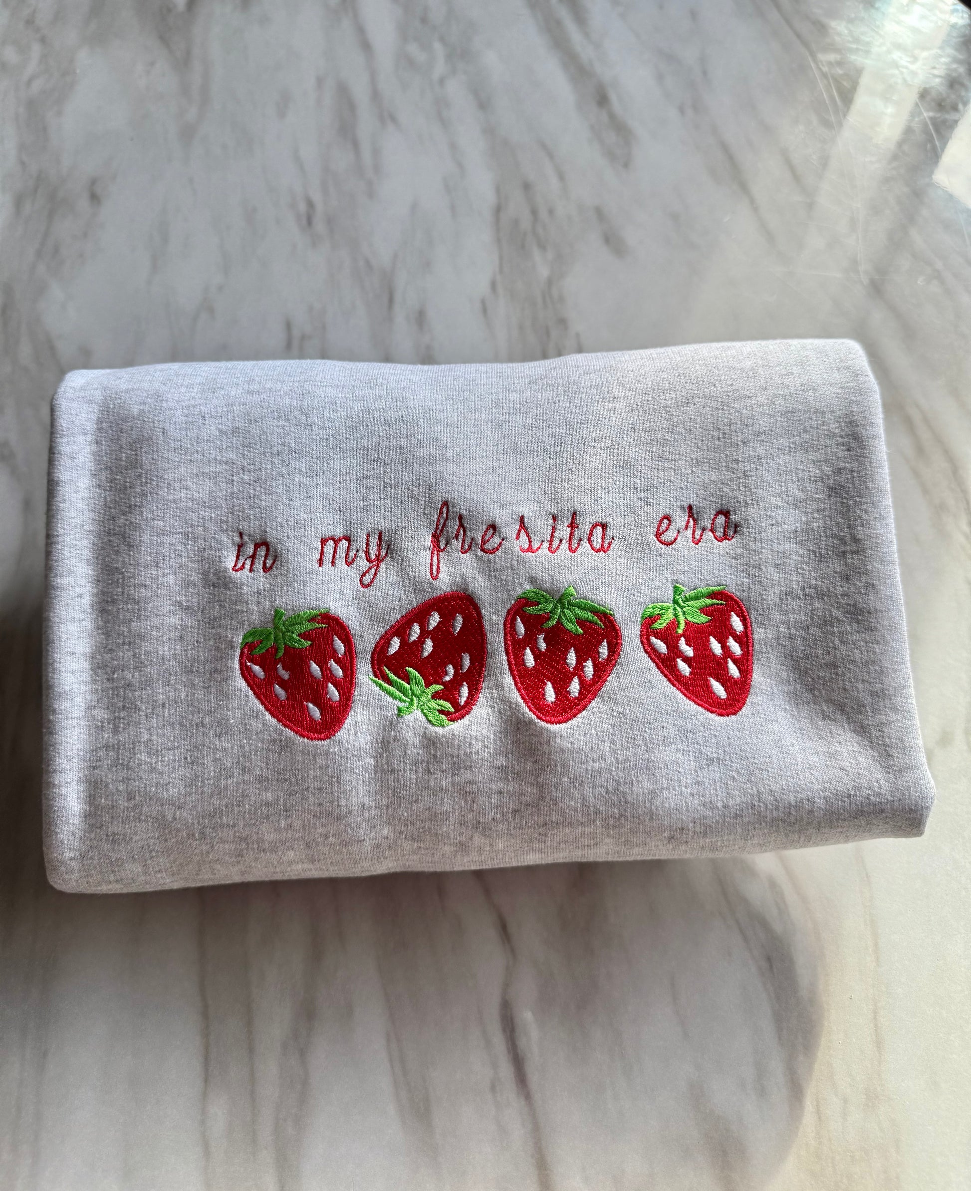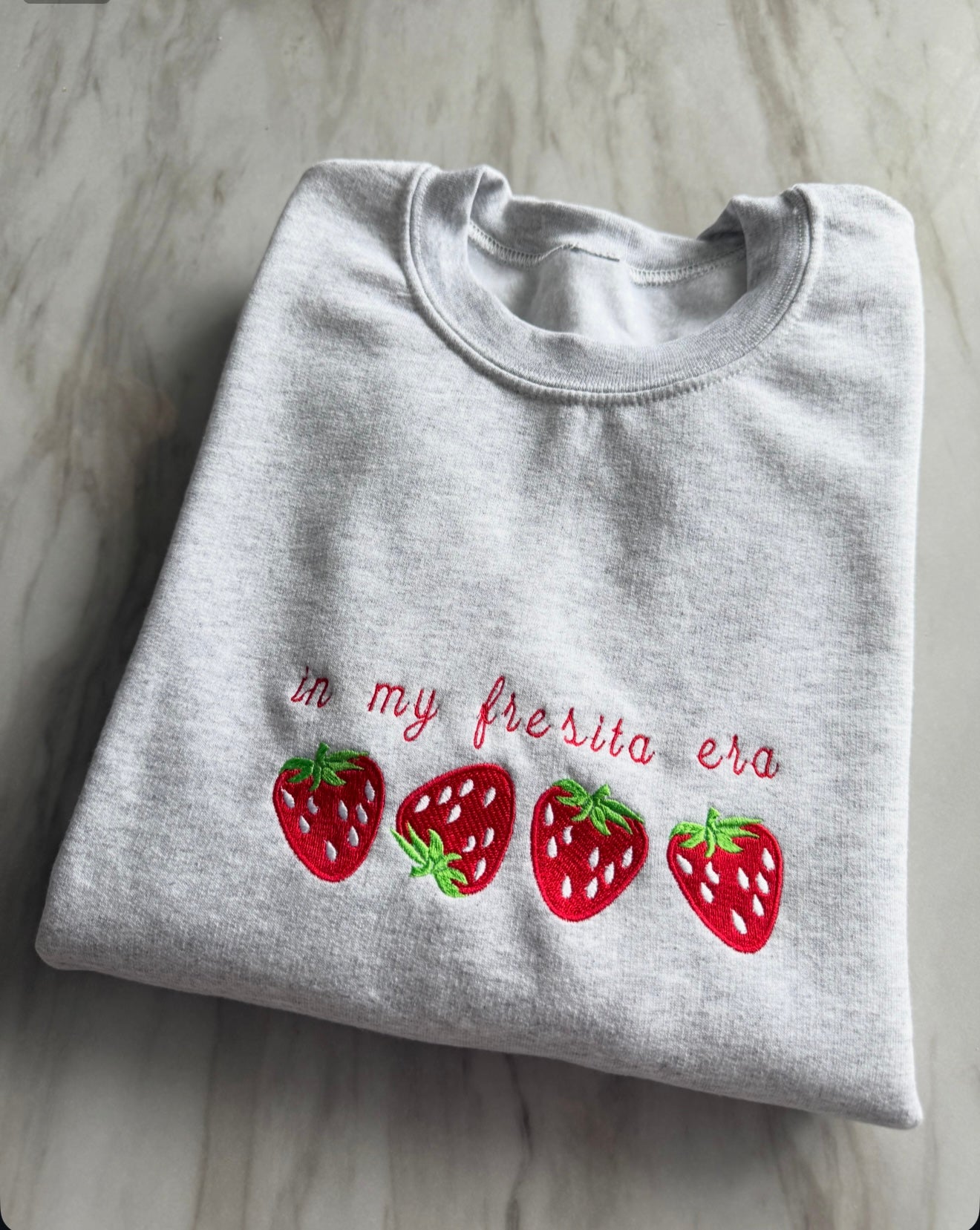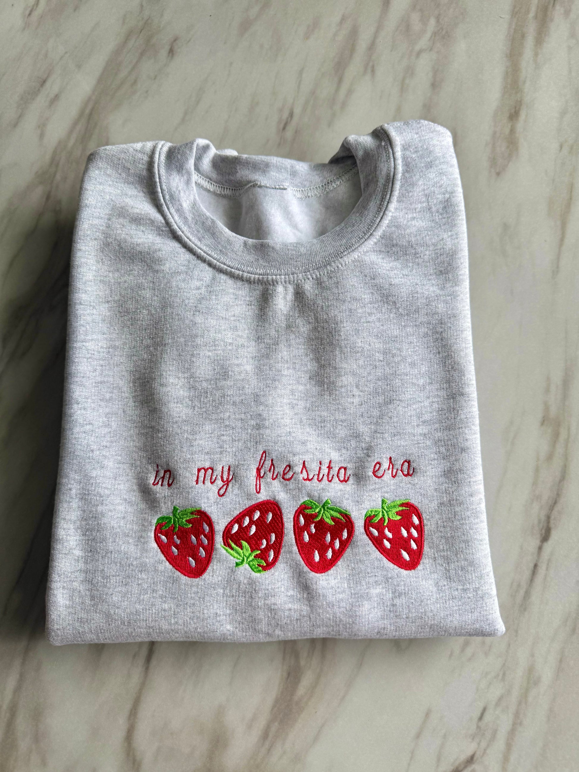 Embrace your girly, pretty era with our playful MI FRESITA ERA sweatshirt! This charming bilingual design celebrates feminine energy with a fun mix of Spanish and English phrases, adorned with sweet embroidered strawberries.