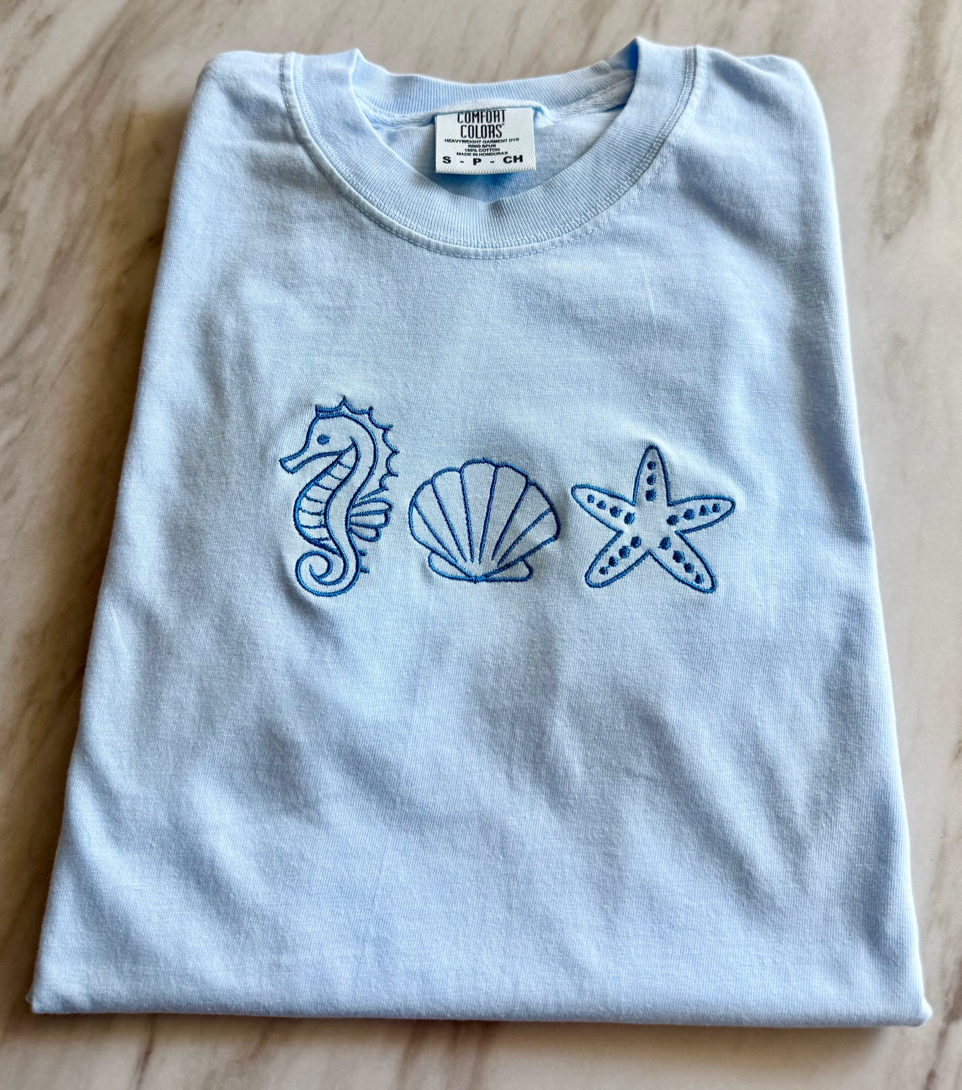 Dive into coastal charm! ๐โญ๐ Our Ocean Trio tee showcases a beautiful embroidered design featuring a seahorse, shell, and starfish on a soft light blue shirt. A perfect tribute to the sea and everything it holds.